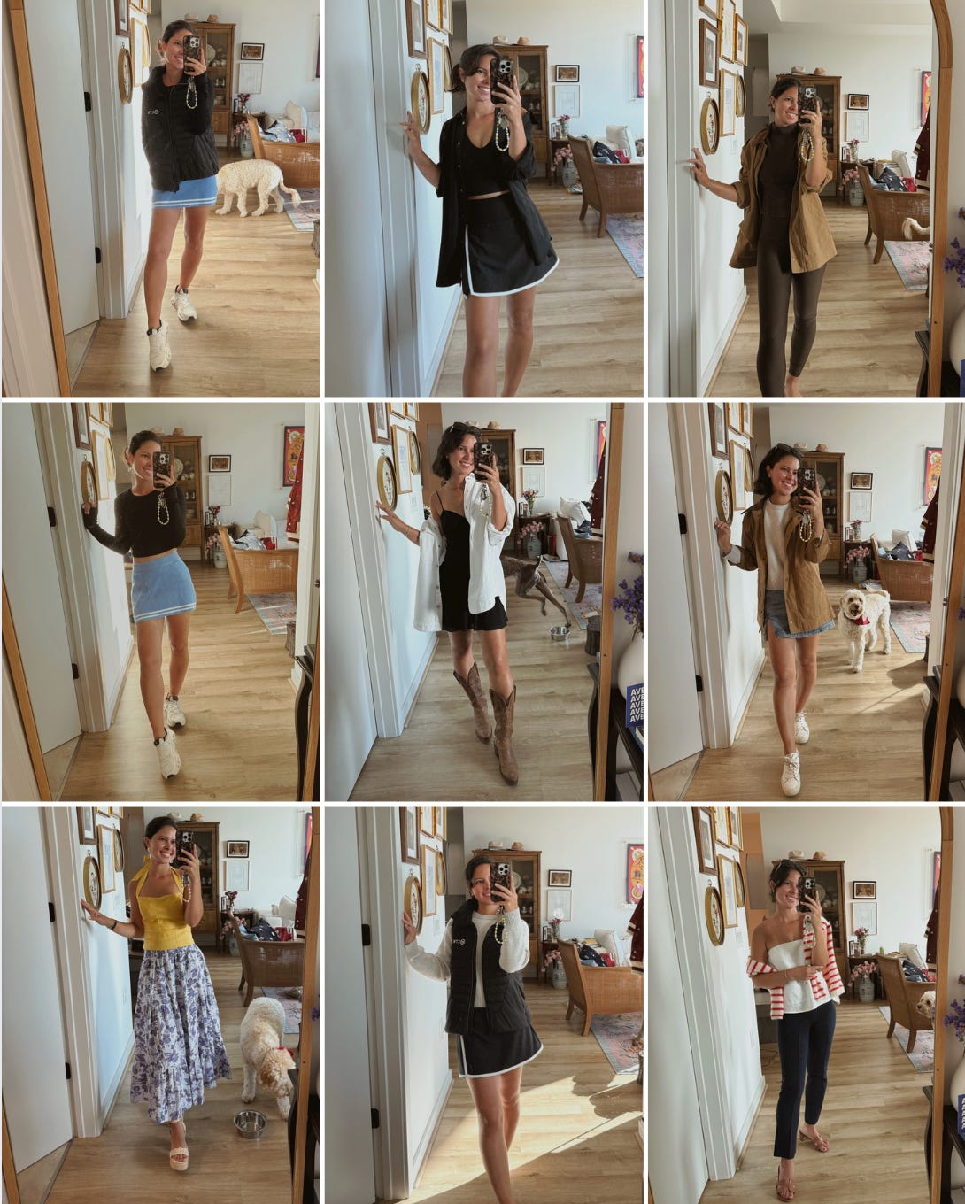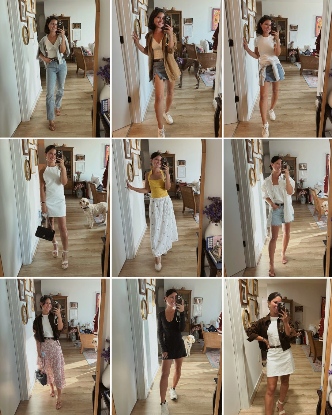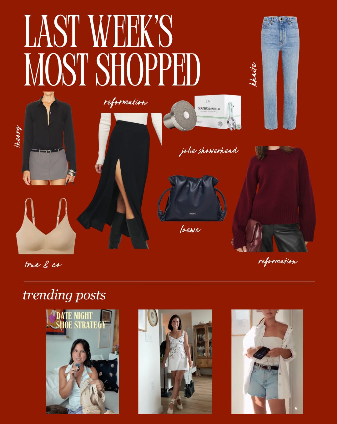 Theory Button Up (I sized up for an oversize fit) // True & Co Bra (love this under my white tees) // Jolie Showerhead // Loewe Flamenco // Reformation Skirt // Reformation Sweater // Khaite Abigail Jeans